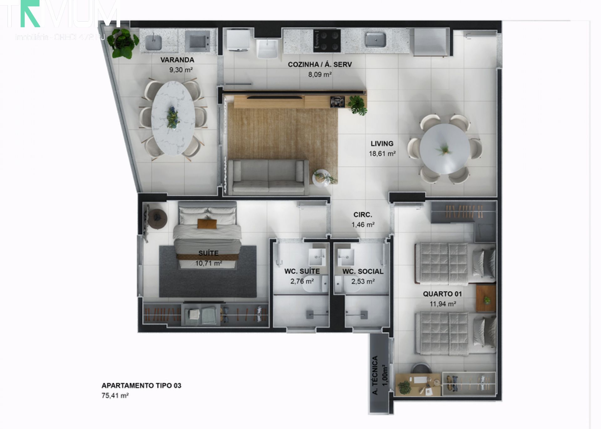 1 Quarto 3 Banheiros 1 Vaga